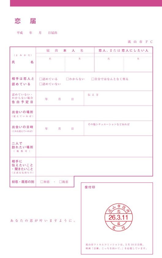 千葉県流山市が2月14日~5月30日の期間限定で受け付けを始めた恋届は、自分の名前と恋人もしくは恋人になってほしい人の名前、出会った場所と日時を記入して市に届け出ることができるサービスです。 恋愛中であることを文書として提出でき、「恋をしている」という「想い」を受け付けてもらえます。