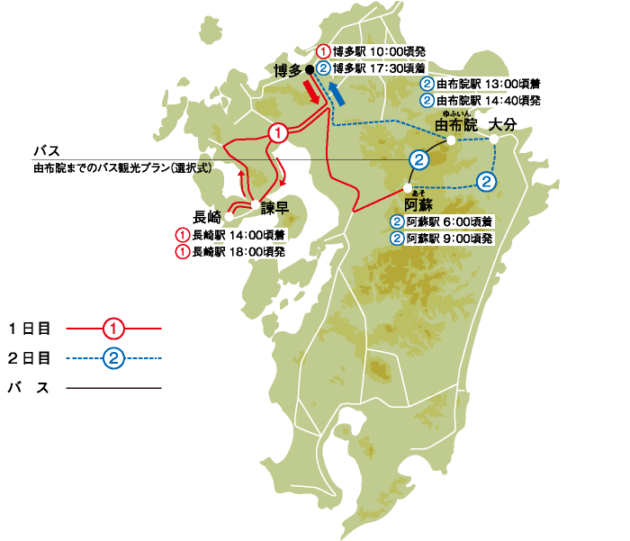 1泊2日と3泊4日の2種類のコースがあり、1泊2日のコースでは、福岡・佐賀・長崎・熊本・大分の5県を巡ります。